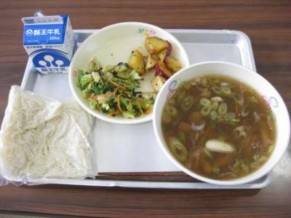 18日 五目うどん、牛乳、大学芋、おかか入りおひたし
