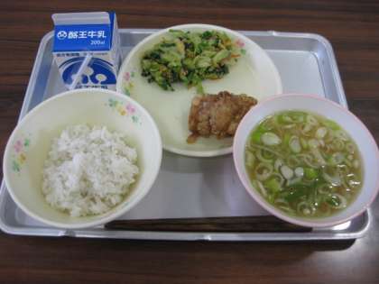 17日 麦ご飯、牛乳、鶏肉の竜田揚げ、ほうれん草のごまあえ、えのき茸のみそ汁