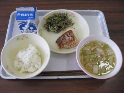 19日 ごはん、牛乳、鮭の塩焼き、磯びたし、さつま芋汁