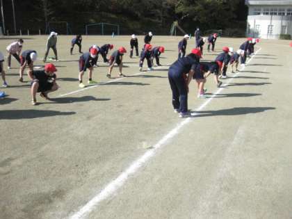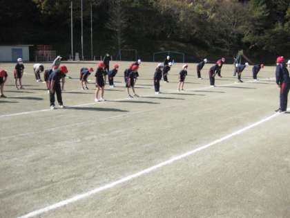 体力と持久力の向上をねらいとして、3校時に校内マラソン記録会を実施しました。風もなく、あたたかい小春日和の中、子ども達は自己ベストを目指して頑張りました。からだ元気委員会が中心となって開会式を行った後、準備運動を行いました。