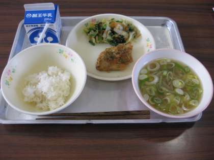 今日の給食は「食育の日」献立です。ごはん、さわらの三味焼き、キャベツのおひたし、さつま汁でした。大変おいしかったです。