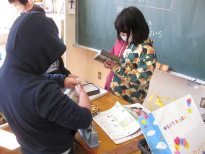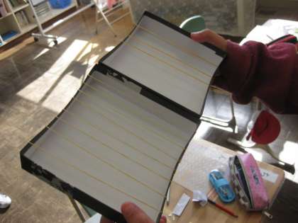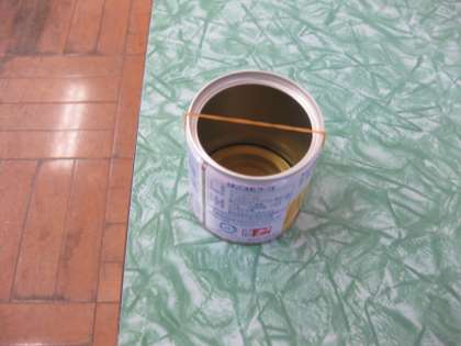 缶詰の空き缶でつくった輪ゴムギターと、空き箱でつくった輪ゴムギターです。缶詰を耳に当てて輪ゴムをはじくと、本物のギターのようなとてもよい音がします。びっくりしました。