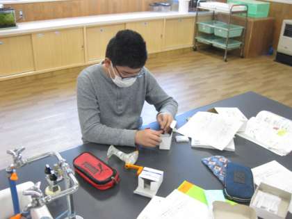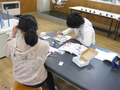 手回し発電機を使って、コンデンサーに電気をため、ためた電気が何に利用できるか調べました。豆電球はすぐに消えてしまいますが、電子オルゴールや発光ダイオードは、しばらくの間鳴り続けたり点灯し続けたりすることがわかりました。