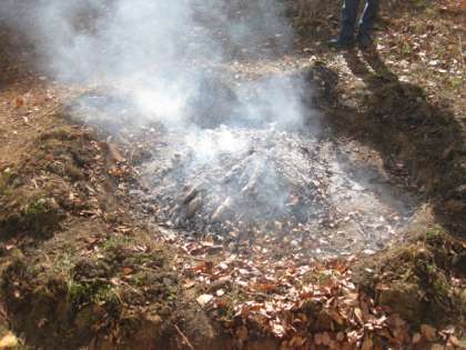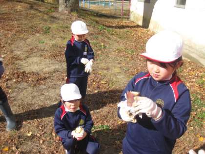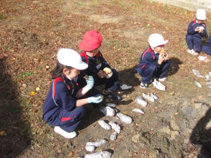 学校の花壇で採れたサツマイモで、やきいもをつくりました。用務員さん、司書の先生にも手伝っていただきました。サツマイモは濡らした紙で包んだ後、アルミ泊で覆いました。落ちた枝と子ども達が拾った落ち葉で、じっくり焼き上げました。