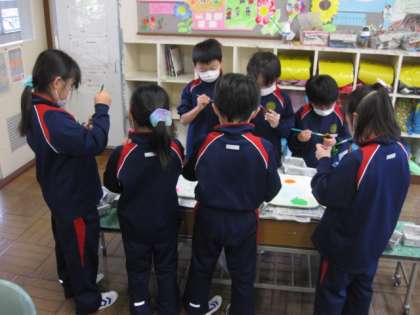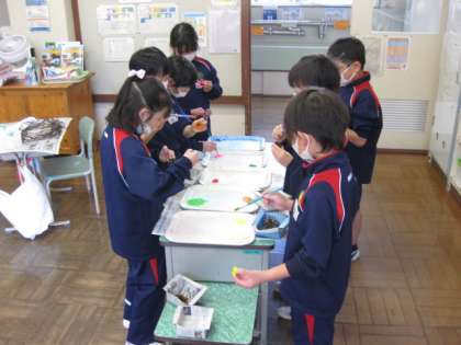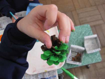 リースづくりに取りくんでいます。松ぼっくりやドングリに色を塗りました。