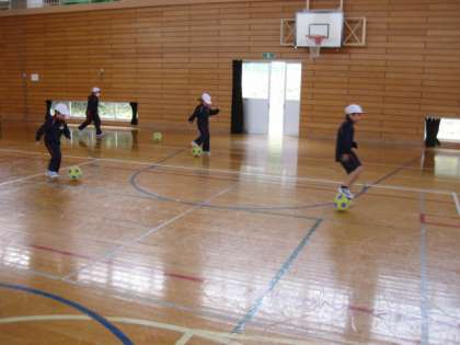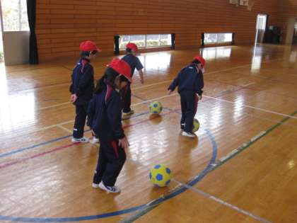 体育館の青い線まで5回ボールを蹴って行く、次に6回蹴って行く等、サッカーのドリブルに挑戦しました。ボールが壁まで転がり、手を使わないのは結構難しいと感じたかもしれません。