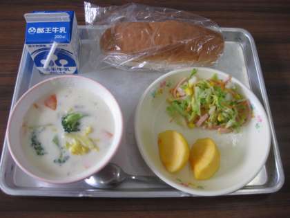 今日の給食は、米粉パン、牛乳、花野菜のクリーム煮、コーンサラダ(フレンチ味)、かきでした。今日も大変おいしかったです。ごちそう様でした。