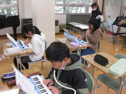 高学年の皆さんの合奏練習の様子です。リコーダーもピアニカも鉄琴も、高学年らしい演奏です。