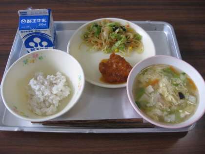 今日の給食は、麦ごはん、牛乳、鶏肉のチリソース、春雨のごま酢あえ、中華玉子スープです。全体として中華風味で、どれも大変おいしかったです。本校の調理員さんがつくる給食は大変おいしいので、ご覧になった皆さんにも是非1度味わってほしいと思っています。おいしい給食ごちそう様でした。