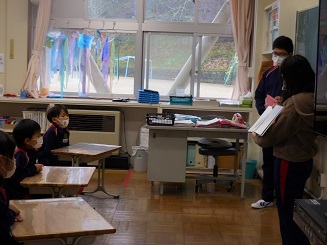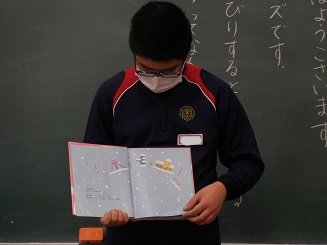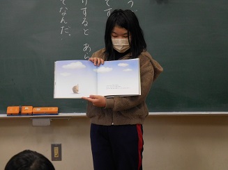 今日の朝の時間に、こころ元気委員会が1年生に読み聞かせを行いました。読み聞かせした絵本は「まいにちがプレゼント」です。1年生は静かに聞いていました。