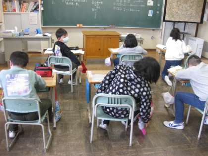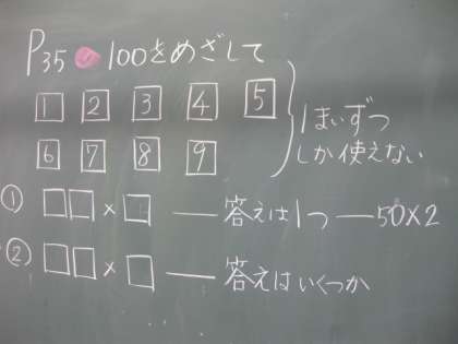 算数の発展問題に挑戦しています。1から9までの数字のカードを1枚ずつ使って、(1)100にするには? (2)100に最も近い数にするには? の2問です。頭を悩ませましたが、正解を見つけた児童がいました。お見事!