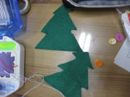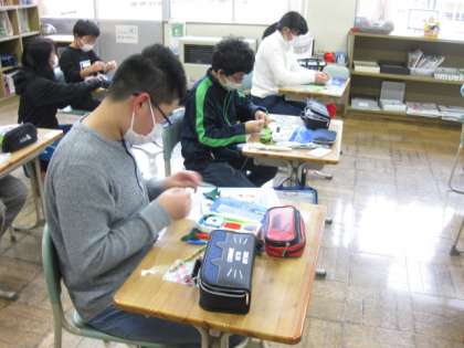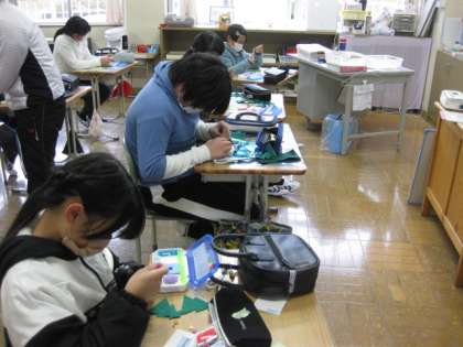 家庭科で裁縫に挑戦しました。クリスマスオーナメントを手縫いでつくっています。
