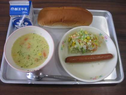 今日の給食は、ドックパン、牛乳、ウインナーのワインソース、コールスローサラダ、コーンスープです。今日も大変おいしかったです。
