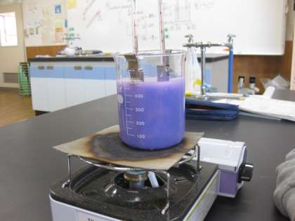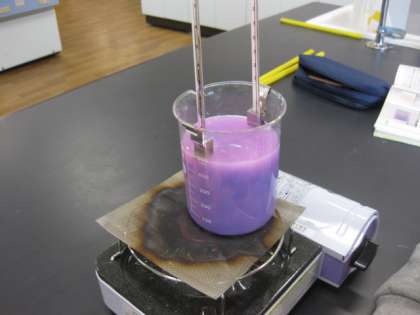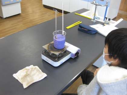 示温インク(サーモインク)を加えた水を加熱する実験を行い、水の熱の伝わり方について学習しました。ビーカーの底の部分と上の部分の温度を測定していますが、サーモインクは、温度が高くなると青色から桃色に変化することから見た目で温度の変化がわかります。実験から底よりも上の方が先にあたたまることがわかりました。