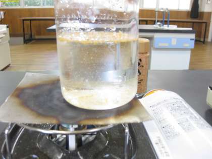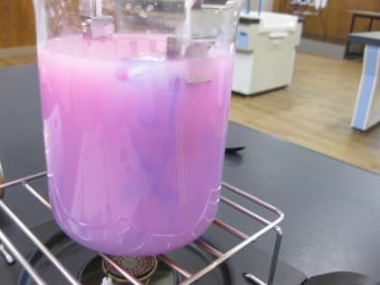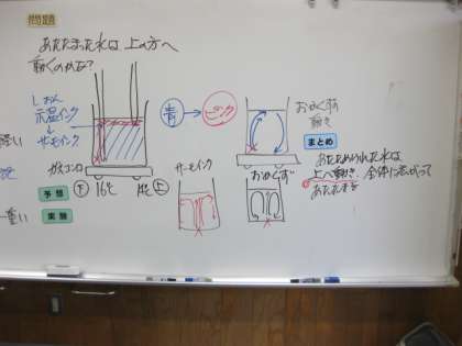おがくずを使って同じ実験をすると、おがくずも下から上へと動くことが観察できました。桃色になったサーモインクに氷を浮かべると、青色に変化した水が下に沈んでいくことも観察できました