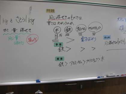 4つのものについて、同じ体積の重さを量りました。同じ体積の時には重い順に、鉄、アルミニウム、プラスチック、木となることがわかりました。
