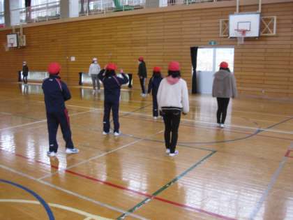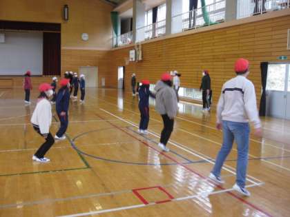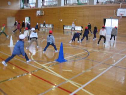 毎朝、なわとびを行っています。まず全員で、準備運動を行います。