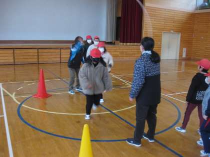 低学年の児童も、テンポよくとべるようになりました。今日は3分間で赤組が65回、白組が120回とべました。