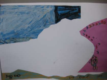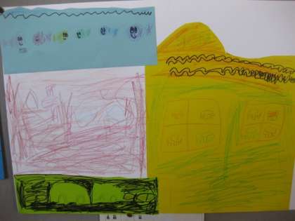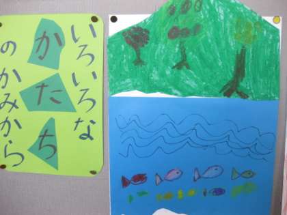 1年生の図画工作の作品です。作品名は「うみの森」、「さかなのべんきょうとレストランとどうろをはしっている車」、「のこぎりとかわのきんぎょとボルダリング」です。