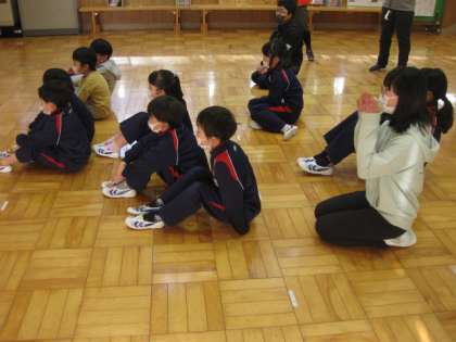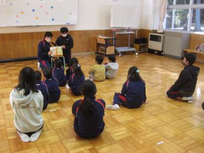 6年生が1・2年生への感謝の気持ちを込めて、朝の時間に感謝の会を行いました。はじめに絵本の読み聞かせを行いました。