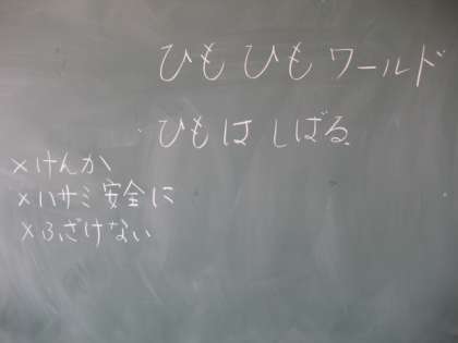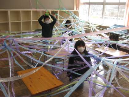3・4年生では、図画工作で「ひもひもワールド」を行いました。学習室がスズランテープで蜘蛛の巣のようになりました。