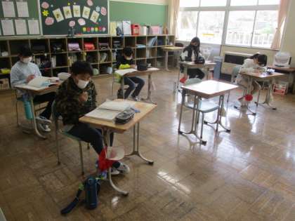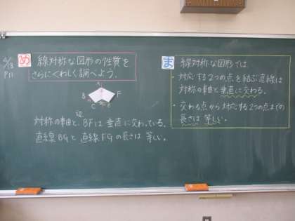 6年生の算数の授業です。線対称な図形について、三角定規を使って学習を進めました。