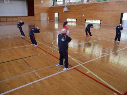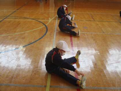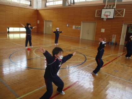 1・2年生の体育の授業です。太鼓の合図に合わせて、様々な運動を行いました。