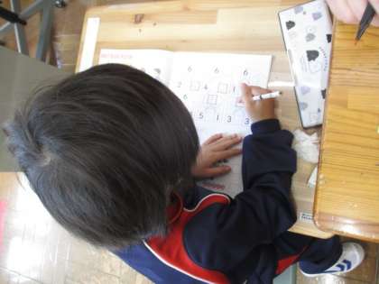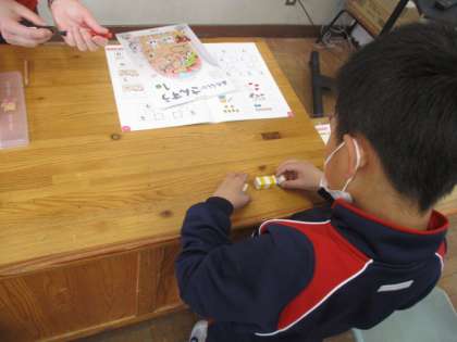 1年生の算数です。ブロックを使って、足し算の学習を行いました。
