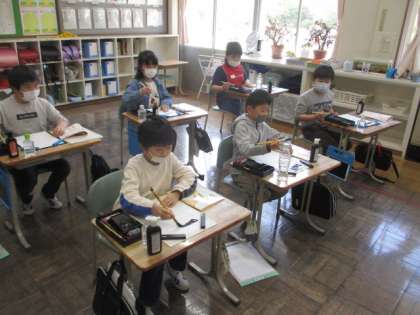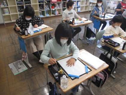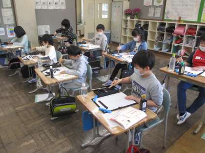 3・4年生の書写です。担任の先生に、筆先の角度等を実際に見せてもらった後、半紙に書いてみました。力の入れ方・抜き方等も子ども達がイメージできるように、ていねいな説明がありました。子ども達は集中して取り組み、とてもよく書けていました。