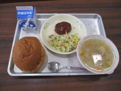 今日の給食の献立は、バンズパン、牛乳、ハンバーグ、コールスロー、コンソメスープです。