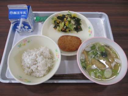 今日の給食の献立は、麦ご飯、牛乳、メンチカツ、和風サラダ、油揚げのみそ汁です。