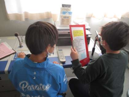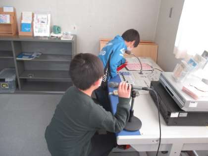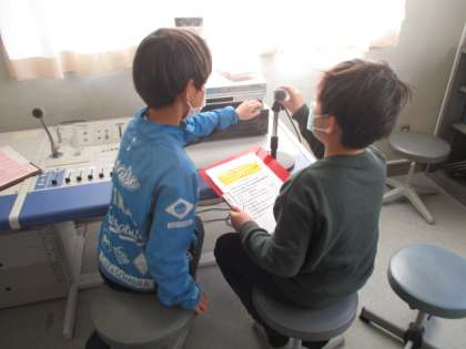 情報発信委員会が朝の放送を行います。今日は男子児童がアナウンスや音楽を担当しました。