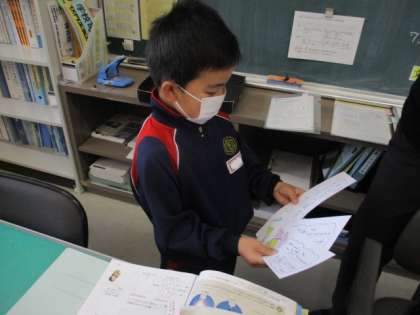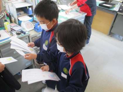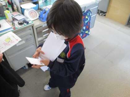 1年生では生活科「がっこうだいすき」の活動で、先生方との名刺交換を行いました。「失礼します」と言って職員室へ入室し、先生方に自己紹介を行った後、名刺を交換することができました。