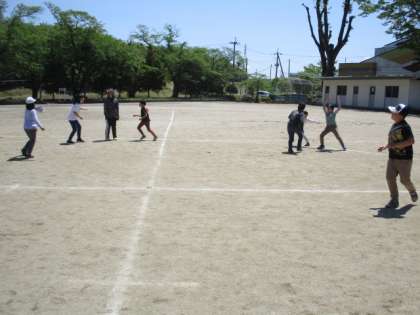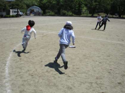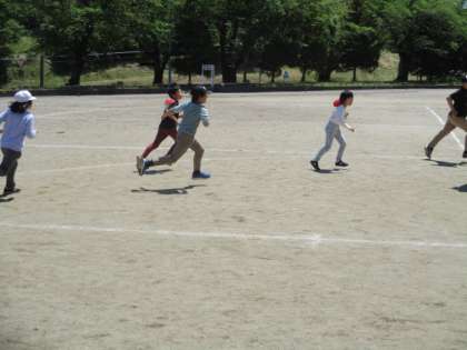 3・4年生の体育です。白線の中でおにごっこをしました。おには2人とし、時間制限を設けました。