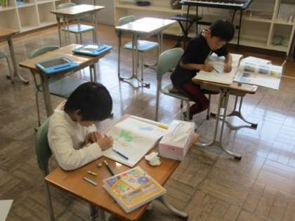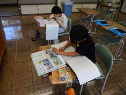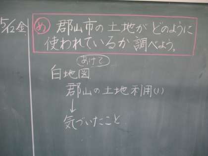 3年生の社会科です。郡山市の白地図に色を塗り、土地がどのように使われているか考えました。集中して取り組んでいます。