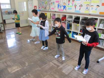 運動会が終わったので、通常の朝の活動を行っています。今月の歌は「気球に乗ってどこまでも」です。