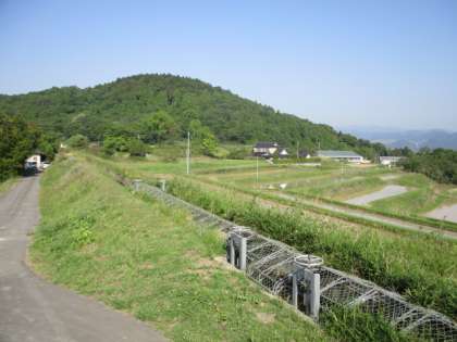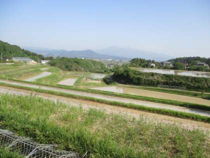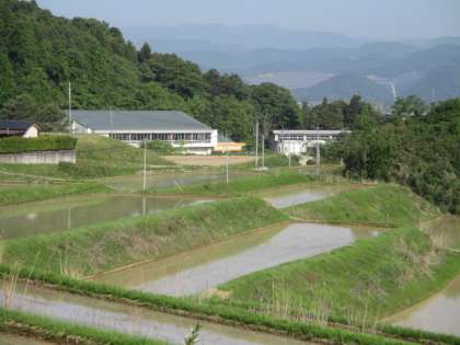 南田山の農道から見た館山と校舎・体育館です。濃い緑色が進んでいます。まさに万緑のグリーンです。近隣の田んぼのほとんどは、田植えが終わっています。朝から日射しが強く、今日も暑くなりそうです。