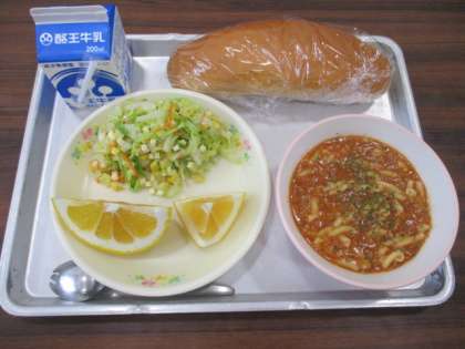 今日の給食の献立は、コッペパン、牛乳、マカロニのミートソース煮、チーズサラダ、ジューシーフルーツです。