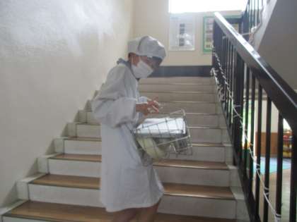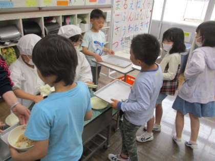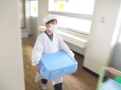 給食当番の皆さんが、給食の準備をしています。1年生も当番として活動を始めました。