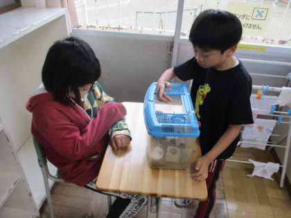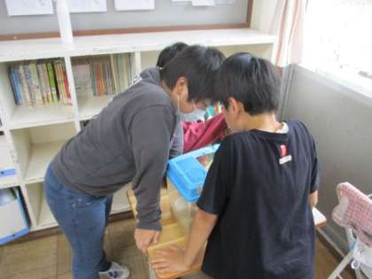 昼休みの様子です。校庭周辺で捕まえたカナヘビを教室で飼育しています。えさとしてクモやミミズを与えたところ、ミミズが食べられて身体が短くなってることを発見しました。