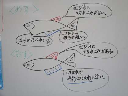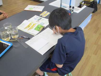 虫眼鏡を用いてメダカを観察しています。最後は見分け方について、しっかりノートにまとめました。