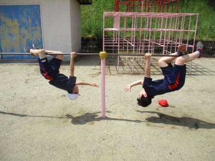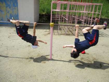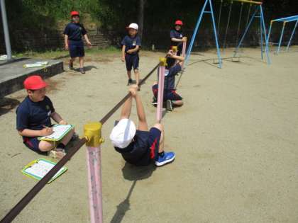 3・4年生の体育の続きです。鉄棒で何級まで行けるか、チャレンジしました。鉄棒に足をかけてジャンケンです。