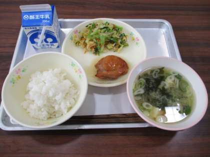 今日の給食の献立は、ごはん、牛乳、鶏肉の照り焼き、アーモンドあえ、わかめのみそ汁です。