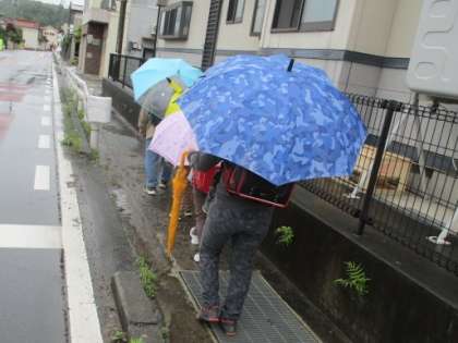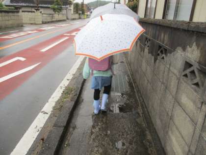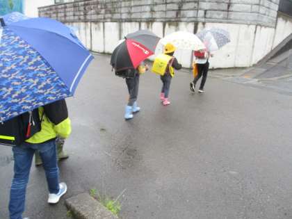 今朝の天気は雨で、午前中は気温が低くひんやりとしていました。朝の登校の様子です。全員が傘をさし、班長さんが先頭になって登校しています。