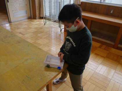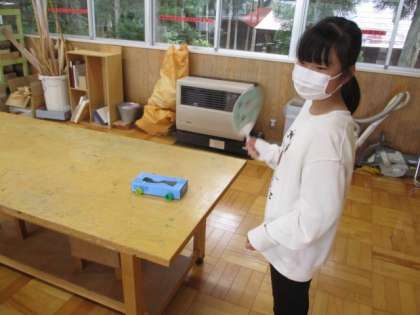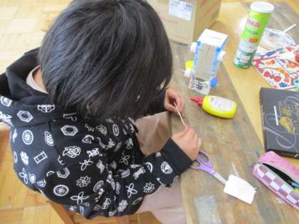 3・4年生の図画工作です。ゴムの力等で「動く車」を作りました。