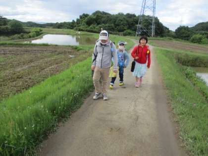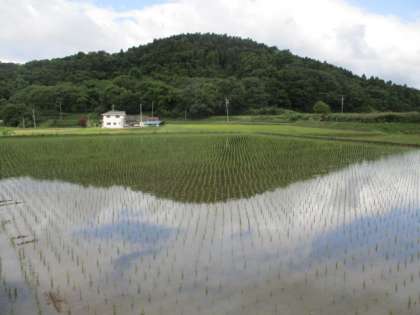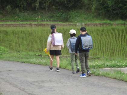 登校の様子です。館山と空が田んぼの水面に映っていました。
