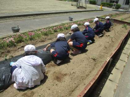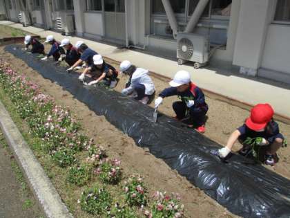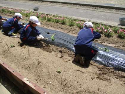 1・2年生の生活科です。サツマイモの苗を植えました。今年度も茎はリースの材料に、育ったおいもは焼きいもにする予定で
