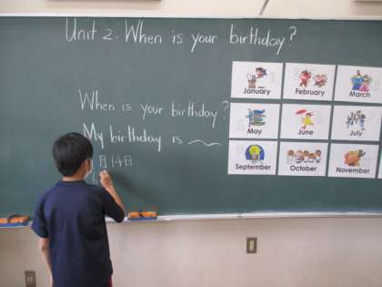 5年生の外国語科です。AETの先生との授業を行っています。