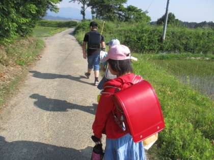 朝の登校の様子です。朝から気温が上がり、暑い中を登校しています。歩いている目の前をキジが通り、少し離れた所でキジの鳴き声が聞こえました。本当に自然が豊かだと感じます。