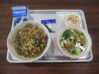 今日の給食の献立は、ビビンバ、牛乳、五目スープ、大豆プリンです。